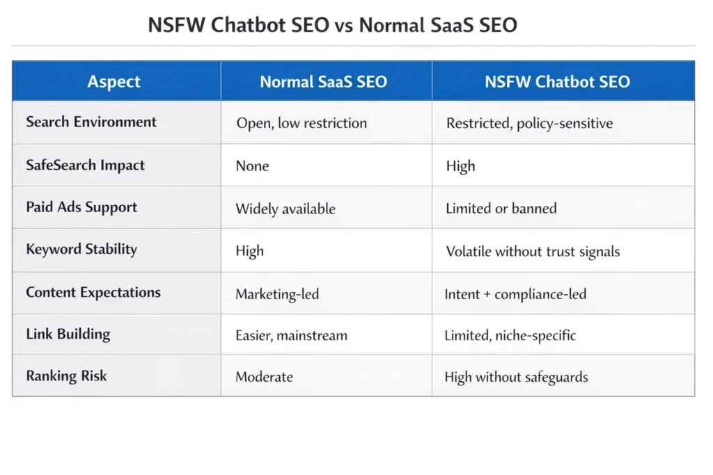 SEO for NSFW chatbots is fundamentally different from SEO for SaaS tools, blogs, or standard AI products. We are not operating in a neutral search environment. We are working inside a restricted, high-risk category where Google applies tighter quality checks, algorithmic filters, and manual scrutiny.